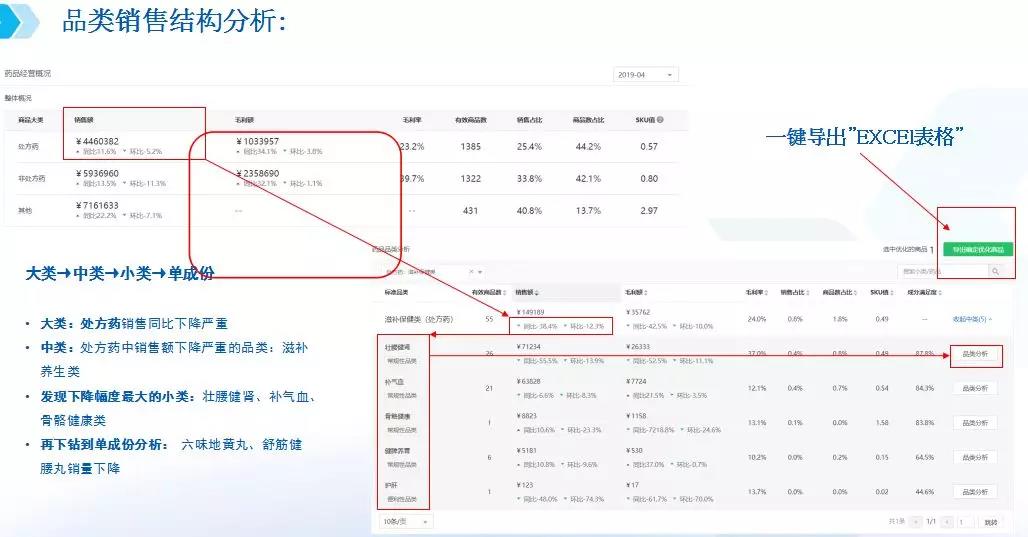 得出分析結果,提升方案就唾手可得了嗎?并不!確定了核心增長品類之后,需從整體到大類、中類、小類、單成分單品進行抽絲剝繭,基于多維逐層分析,最后才能精準地制定出提升方案。