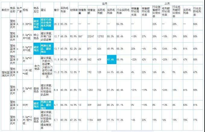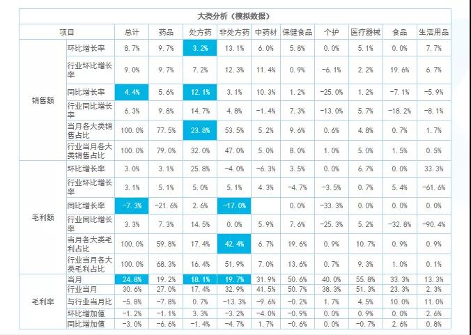 大類分析主要看整體銷售結構,找出核心大類的增長機會點。例如,這組數據中不管是整體毛利率還是銷售額增長率,都低于行業均值。細分處方藥、非處方藥及中藥等品類的情況可以看出,處方藥的同環比銷售額以及銷售占比均低于行業值,而毛利率卻高于行業值?梢缘贸觯瓿踔贫ㄌ幏剿帪楹诵脑鲩L大類的策略沒有落地。所以,接下來做中類、小類跟單成分分析的時候需要進行針對性監控。
