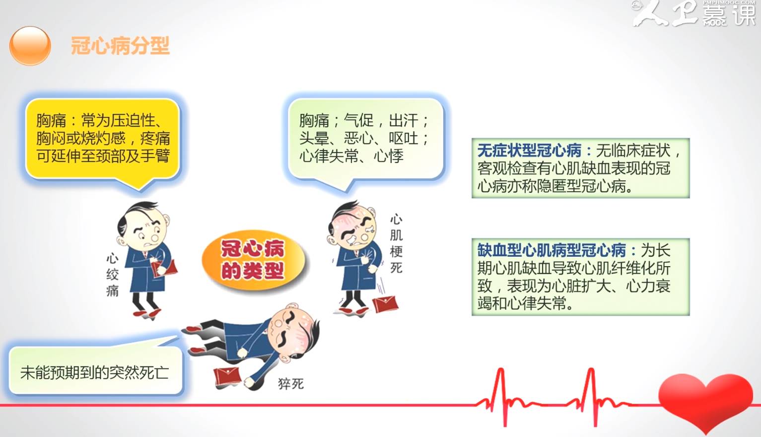 4. 無癥狀型冠心病: 病人無臨床癥狀,客觀檢查有心肌缺血表現的冠心病亦稱隱匿型冠心病。病人多屬中年以上,無心肌缺血的癥狀,在體格檢查時發現心電圖有ST段壓低、T波倒置等,或放射性核素心肌顯像顯示心肌缺血表現。