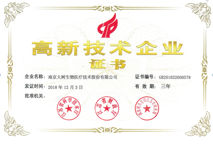 近日,我公司獲得由江蘇省科學技術廳、江蘇省財政廳、國家稅務總局江蘇省稅務局聯合頒發的“高新技術企業”證書,由此正式邁入國家高新技術企業行列。南京大樹生物醫療技術股份有限公司是一家集研發、生產、銷售為一體的專業體外診斷試劑醫療器械公司,公司秉承“質量為先、信譽為重、以人為本、精益求精”的質量方針,通過我們的專業技能和不懈努力竭力為廣大客戶提供創新優質的產品及完善的售后服務!